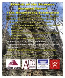 The Friends of the Shawnee National Forest will mark 15 years of stewardship on Saturday, November 8 at Alto Vineyards, 8515 Highway 127, Alto Pass, IL.